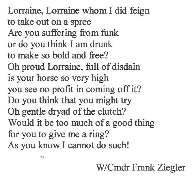 So in 1941, Lorraine became a WAAF at Biggin Hill where she was assigned to the transport division. She quickly discovered it was not for the faint-hearted. 'One of the tasks on my first day was to get into the inspection pit and empty the oil sump of a 3-ton lorry and give it an oil change. But the whole lot gushed out over me! I must admit I was pretty shattered when I realised how dirty I was when I eventually emerged from the pit. We also had to paint up all the vehicles in camouflage which was a huge job and very tiring. All the drivers, mainly female, had to be able to handle anything on four wheels from 3-ton lorries to petrol bowsers to cars and vans of all shapes and sizes. Luckily, I'd learnt how to drive before I joined up. My main job was to drive the young pilots to and from their dispersal points. These happy, brave and wonderful men -- one of whom I married -- very often did not return from their mission. It was heart-breaking for all us who were waiting for them to return. I also had to do night shifts and I particularly hated driving at night because our headlights had to be almost blacked out, there were no street lights and in winter there were terrible pea-soup fogs. We often had to go from camp down the hill to Keston for night duty in the Ops Room but usually one of the men would get out and guide us down, it was that dark! One of the jobs I enjoyed most was driving the camp Padre, Canon Douglas O'Hanlon (father of the author Redmond O'Hanlon). He was always kind and considerate and comforting to talk to. He also wrote wonderful poetry! He was a welcome change from the frisky Free French pilots!' Dougie O'Hanlan was not the only one who wrote poetry to Lorraine (see below).