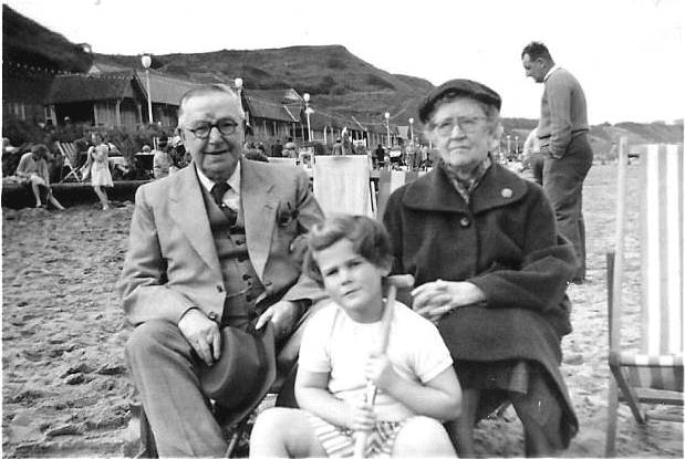 The picture of the family above on the left was taken in the garden of their house in Park Lodge Lane. It was quite large and reflected Grandpa's standing in the Wakefield community -- four storeys high with rooms for servants, although my grandma only had one, a cleaner. The main kitchen was in the cellar and had to be accessed round the back of the house where there was also a chute to pour the coal into a cellar. By the time I visited the house in the 1950's they didn't use the cellar kitchen anymore and had built a second one on the ground floor which had a butler's sink in a huge cupboard. It was painted the green and cream of post-war Britain and was very gloomy. I thought it looked like something out of a museum. Granny Balmforth was also something of a relic. For a start, her name was Euphemia which the rest of the family thought was hilarious although she didn't share the joke. She was a staunch Methodist and was very prudish and straight-laced which you can see in her face. And possibly why she was wearing a hat and coat on the beach, see above. In her later years she would hit the sherry bottle and my cousin Margaret used to find her on the floor when she went round on the way home. Granny in her later years became intolerant to alcohol and after being found drunk had to give it up. She used to declare she was a strict Methodist