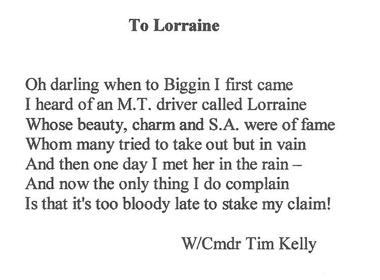 So in 1941, Lorraine became a WAAF at Biggin Hill where she was assigned to the transport division. She quickly discovered it was not for the faint-hearted. 'One of the tasks on my first day was to get into the inspection pit and empty the oil sump of a 3-ton lorry and give it an oil change. But the whole lot gushed out over me! I must admit I was pretty shattered when I realised how dirty I was when I eventually emerged from the pit. We also had to paint up all the vehicles in camouflage which was a huge job and very tiring. All the drivers, mainly female, had to be able to handle anything on four wheels from 3-ton lorries to petrol bowsers to cars and vans of all shapes and sizes. Luckily, I'd learnt how to drive before I joined up. My main job was to drive the young pilots to and from their dispersal points. These happy, brave and wonderful men -- one of whom I married -- very often did not return from their mission. It was heart-breaking for all us who were waiting for them to return. I also had to do night shifts and I particularly hated driving at night because our headlights had to be almost blacked out, there were no street lights and in winter there were terrible pea-soup fogs. We often had to go from camp down the hill to Keston for night duty in the Ops Room but usually one of the men would get out and guide us down, it was that dark! One of the jobs I enjoyed most was driving the camp Padre, Canon Douglas O'Hanlon (father of the author Redmond O'Hanlon). He was always kind and considerate and comforting to talk to. He also wrote wonderful poetry! He was a welcome change from the frisky Free French pilots!' Dougie O'Hanlan was not the only one who wrote poetry to Lorraine (see below).